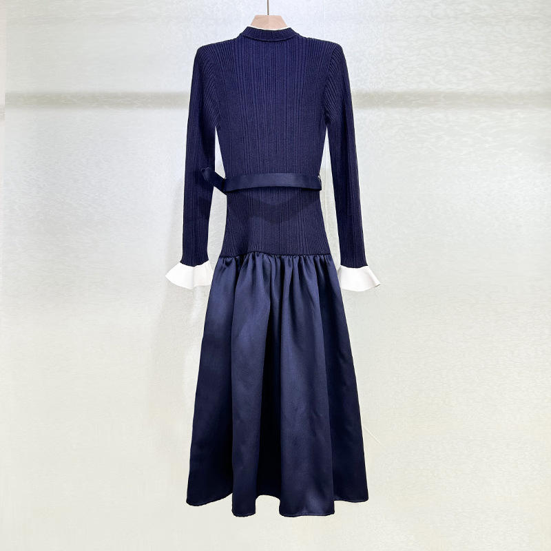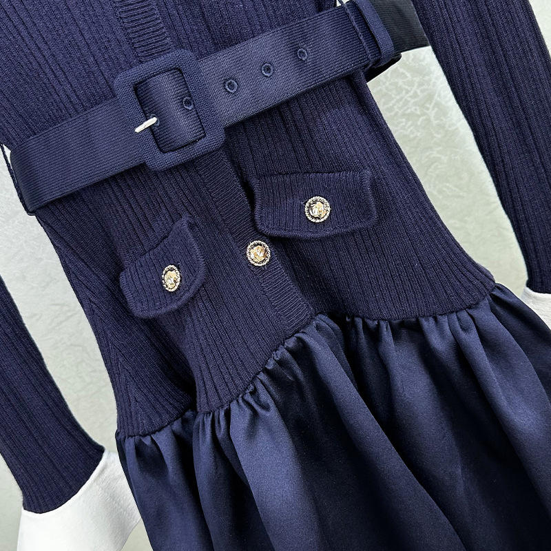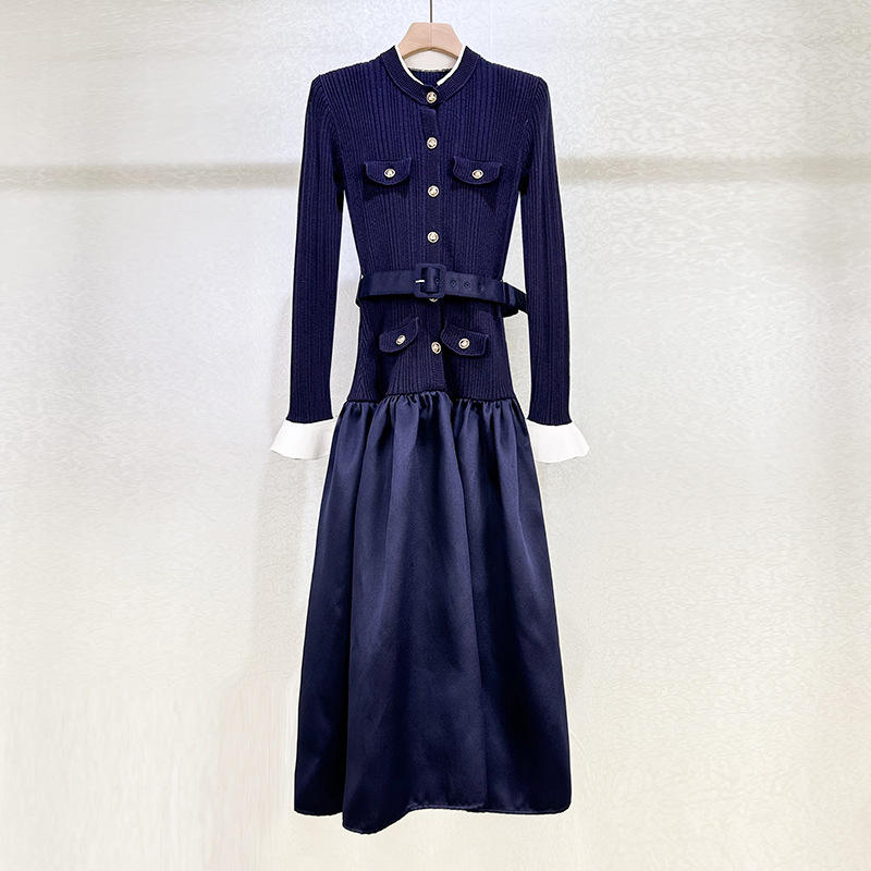 Abito in Maglia Blu Navy Autunno/Inverno, Vendita all'Ingrosso, Elegante Vestito da Festa a Maniche Lunghe con Bottoni e Patchwork