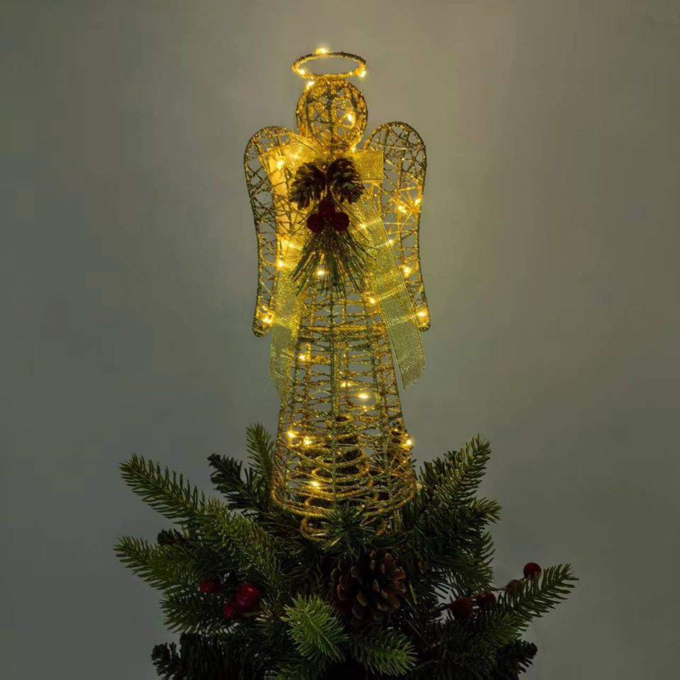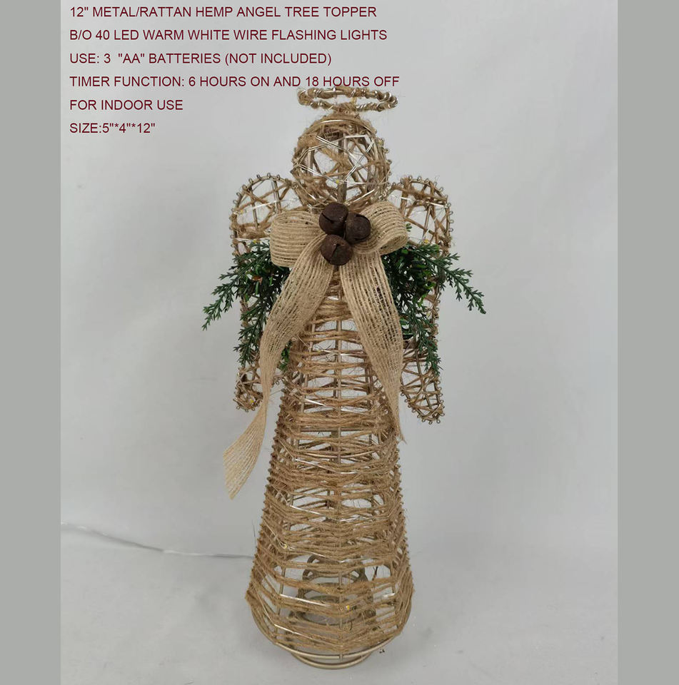Angelo in Ferro e Rattan da 12 Pollici con Luci LED Bianco Caldo e Timer 6 Ore, Decorazioni Natalizie per Interni con Stelle sulla Punta dell'Albero