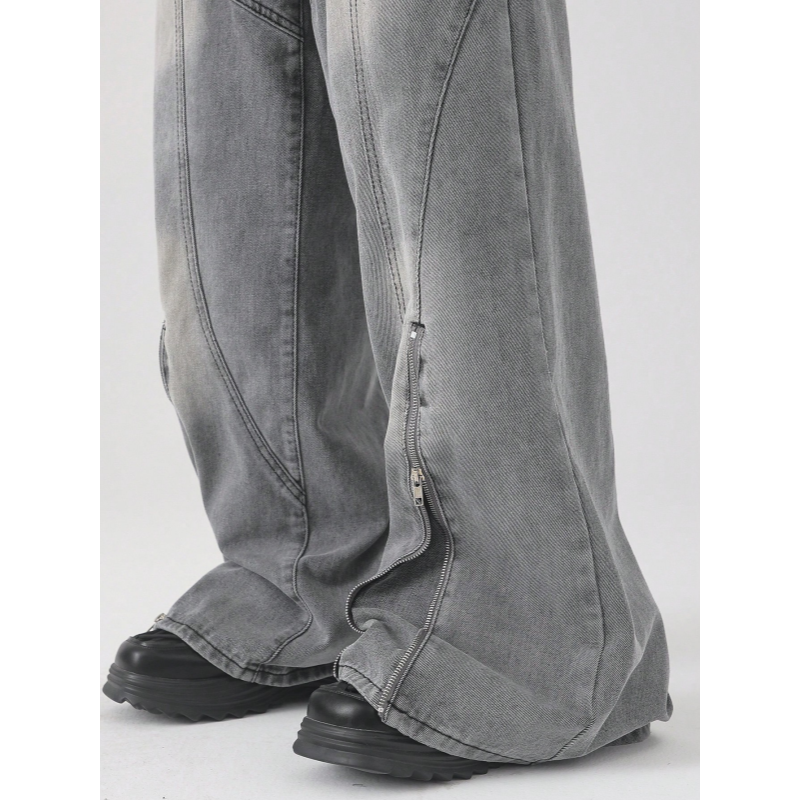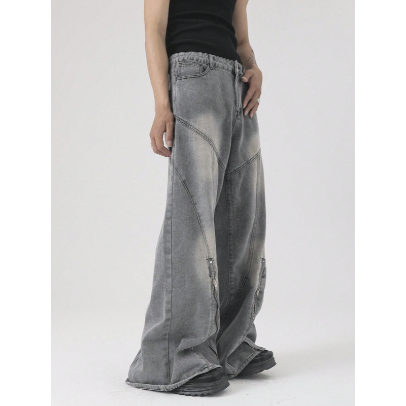 Jeans Oversize a Gamba Larga da Uomo in Denim Grigio Effetto Acid-Wash con Cerniera Laterale Unisex Stile Futuristico