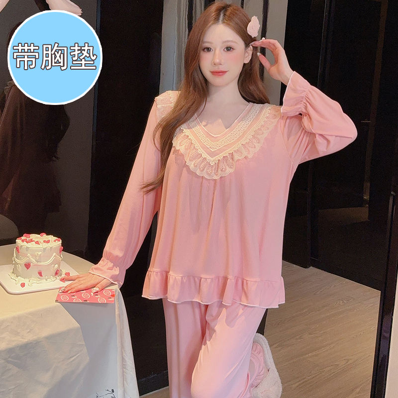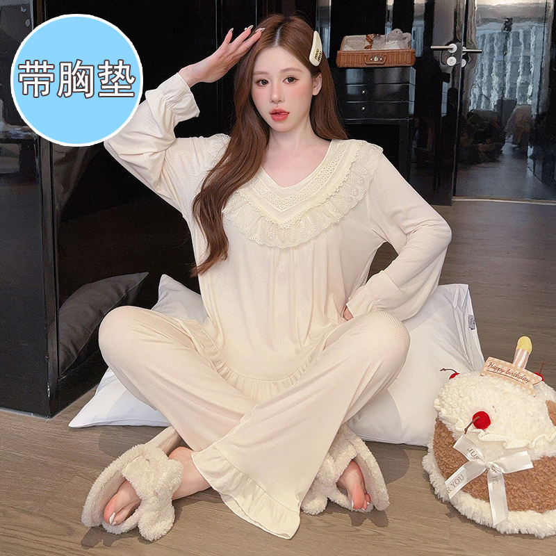 Fall Women's Modal Sleepwear Fashion Lace V-neck Long Sleeve Wide-leg Pants Home Wear Set With Chest Pad 5XL Large-sized Suit