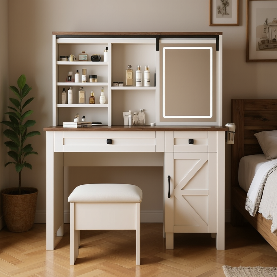 Set Toeletta Stile Rustico con Specchio Scorrevole Illuminato, Ripiani Multilivello e Mobiletto a 2 Cassetti, Arredamento Camera da Letto