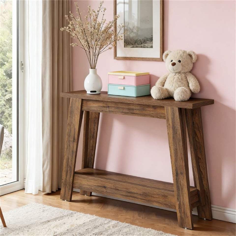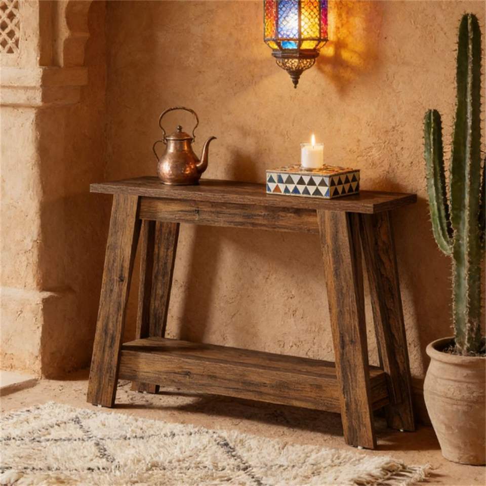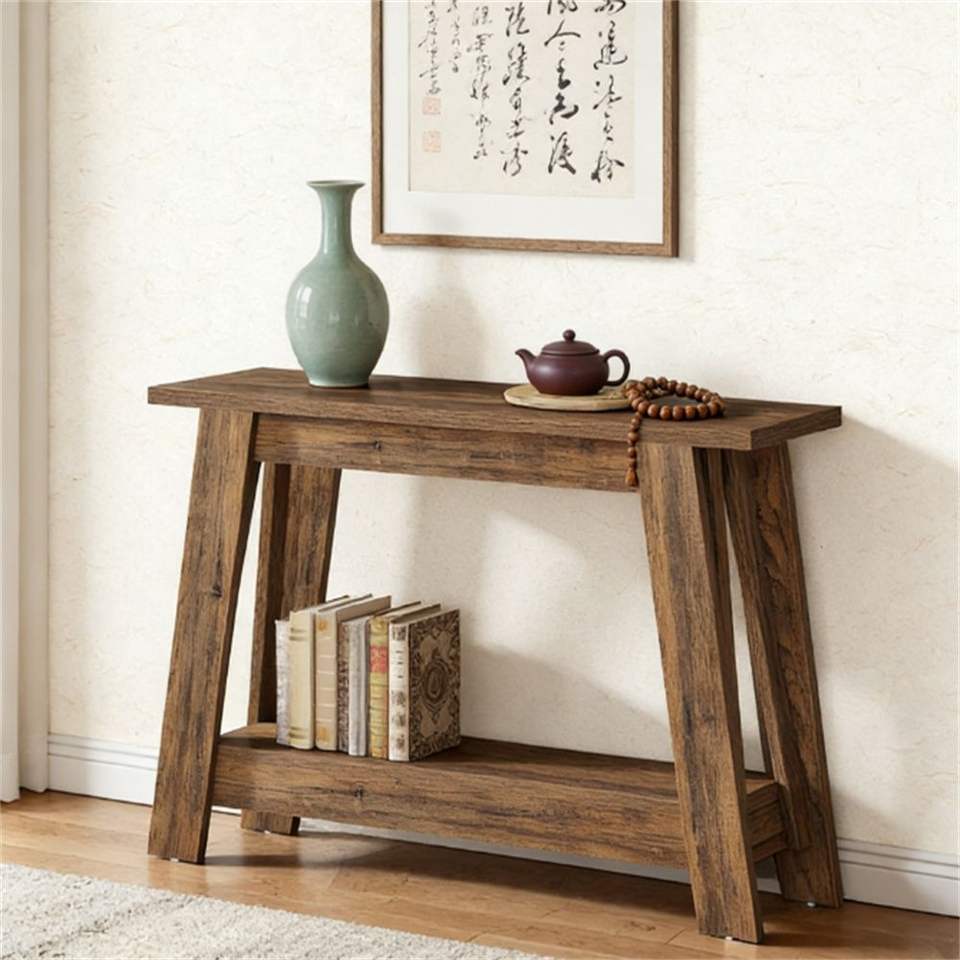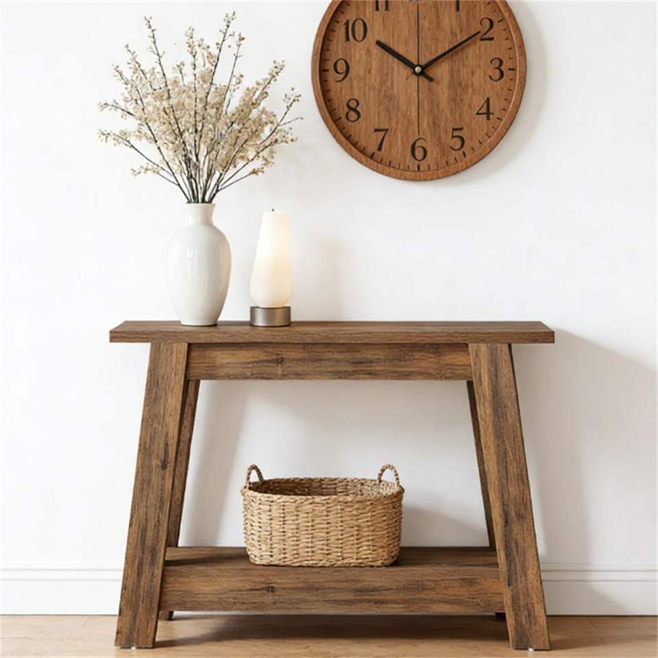 Consolle a doppio strato in stile rustico con ripiani aperti e spazio contenitore per ingresso, foyer o divano