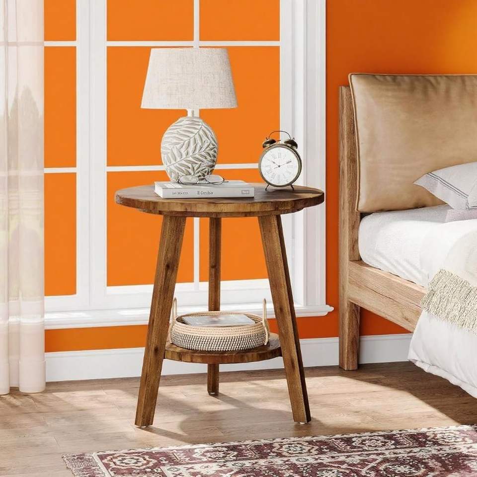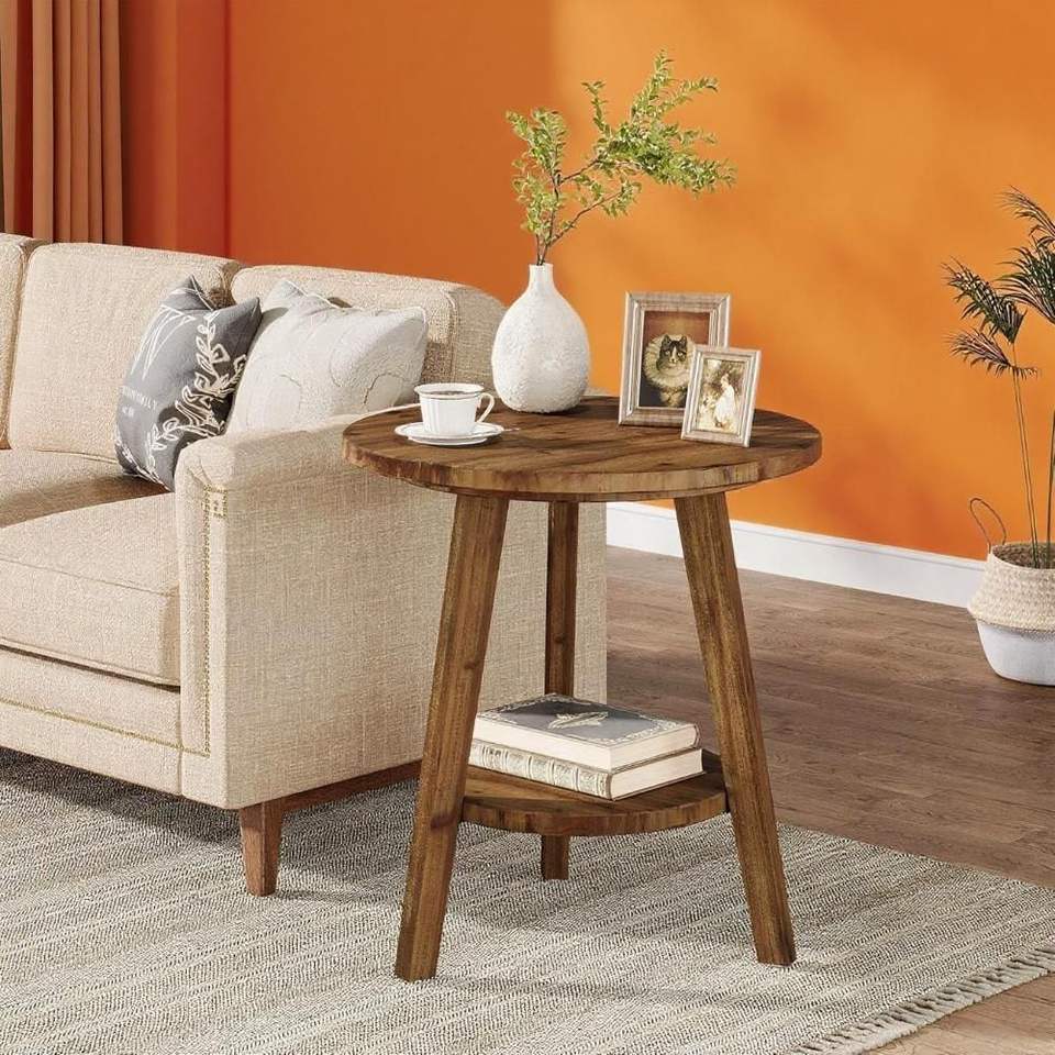 Tavolino Rotondo in Legno Stile Rustico con Ripiano Portaoggetti, Ideale come Tavolino Laterale o Comodino per Soggiorno