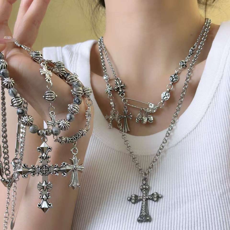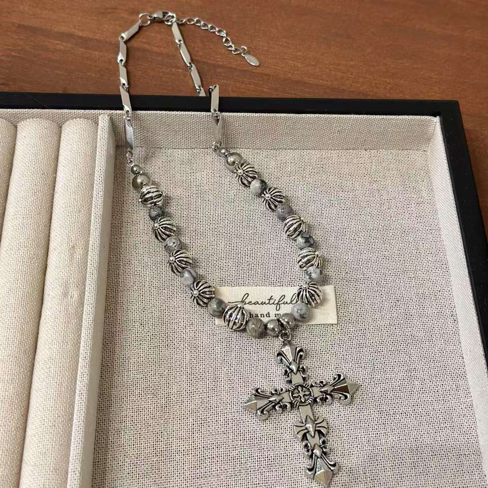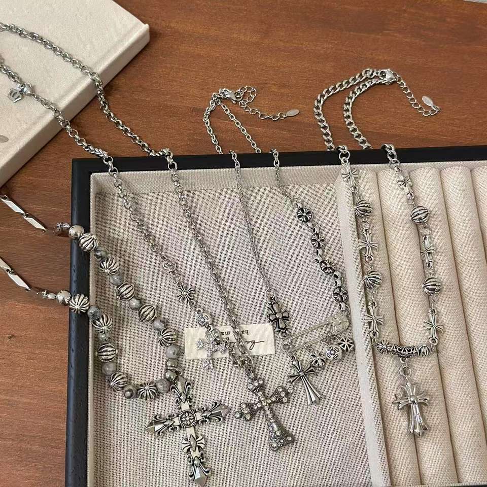 Fashion Alloy CH Retro Antique Silver Cross Pendant Necklace, Trendy Diamond-studded Hip-hop Punk Men's and Women's Jewelry