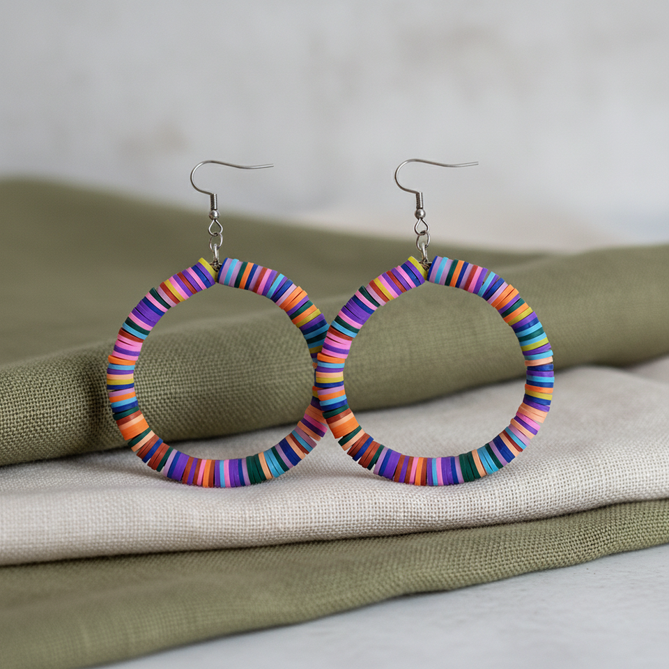 Orecchini a cerchio con paillettes di perline Heishi in argilla polimerica multicolore arcobaleno di moda bohémien