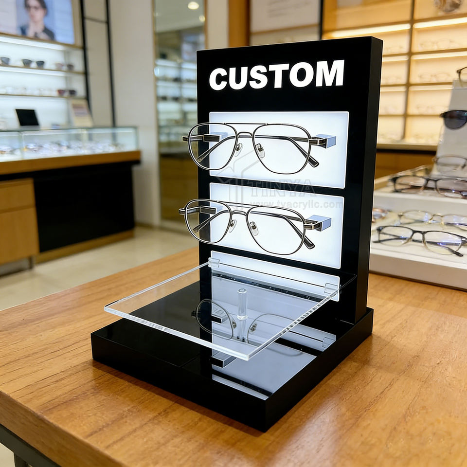Espositore da Tavolo in Acrilico Nero Trasparente con LED per Occhiali da Vista e da Sole, Mezzo Bordo, per Negozi