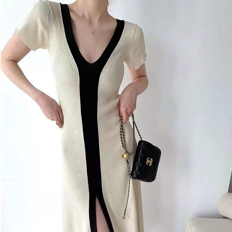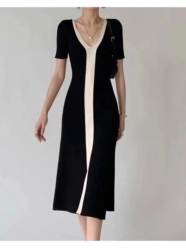 Abiti dal Design alla Moda con Scollo a V, Maniche Corte, Contrasto di Colori, Vestito Estivo in Maglia Femminile, Slim, Vintage ed Elegante