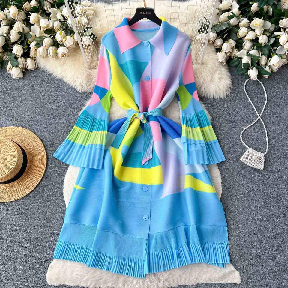 Moda stampa geometrica Miyake drappeggiato plissettato abito da donna coreano manica svasata elasticizzata cintura lacci Vestido abiti Casual