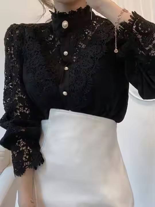 Fashion Hollow Oversize White Blouse 2025 Chic Elegant Floral Lace Fluffy Long Sleeve Top Women Chiffon Button Turtleneck Shirt