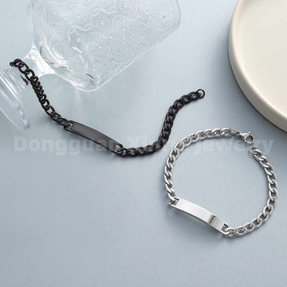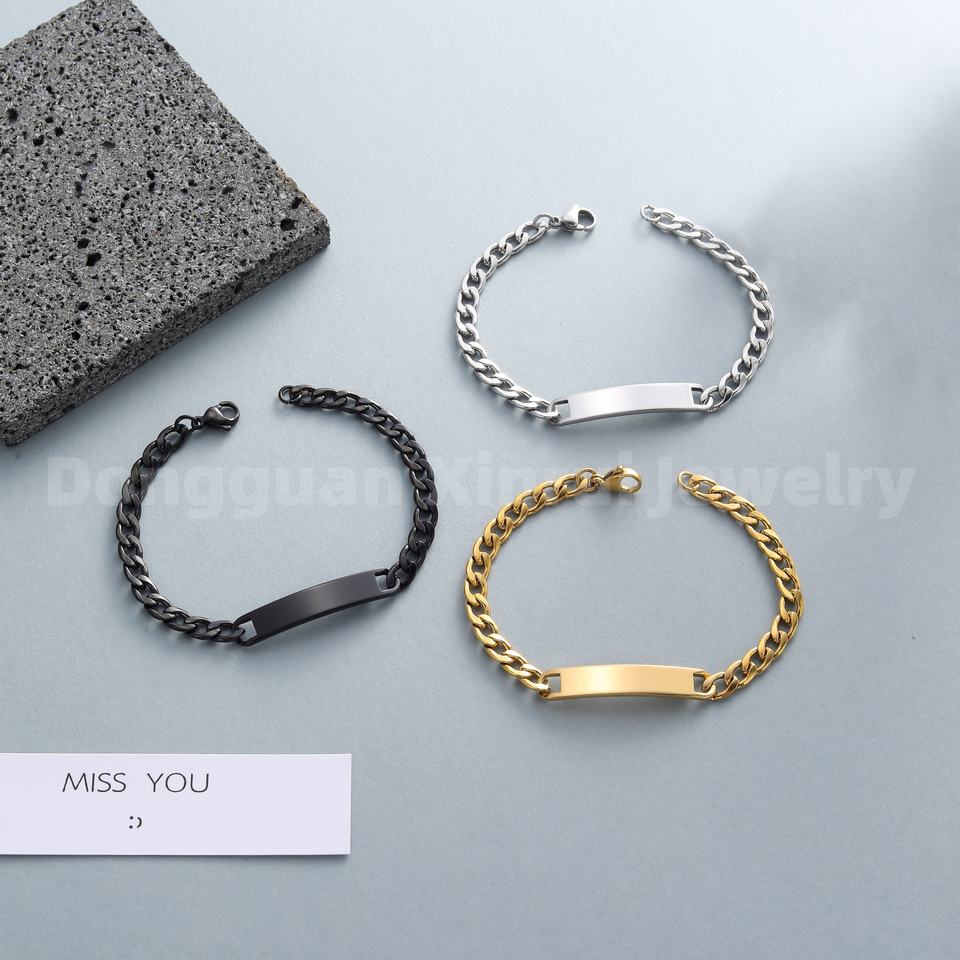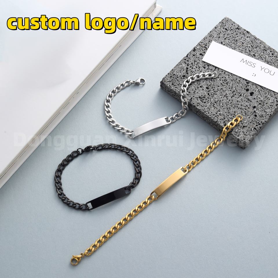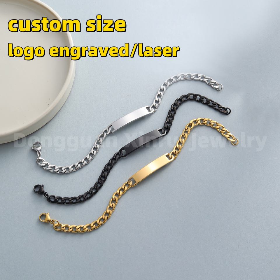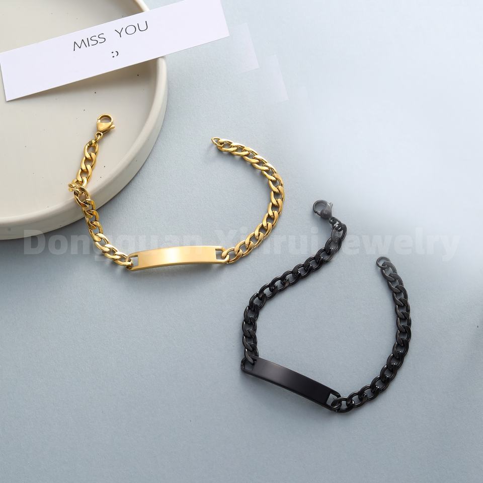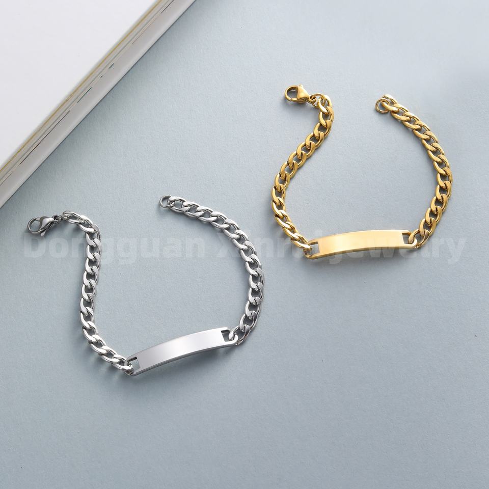 Fashion Jewelry Logo Name Customized Engraved Blank Bar Bracelet 18K Gold PVD Plated Curb Chain Stainless Steel Men Bracelet