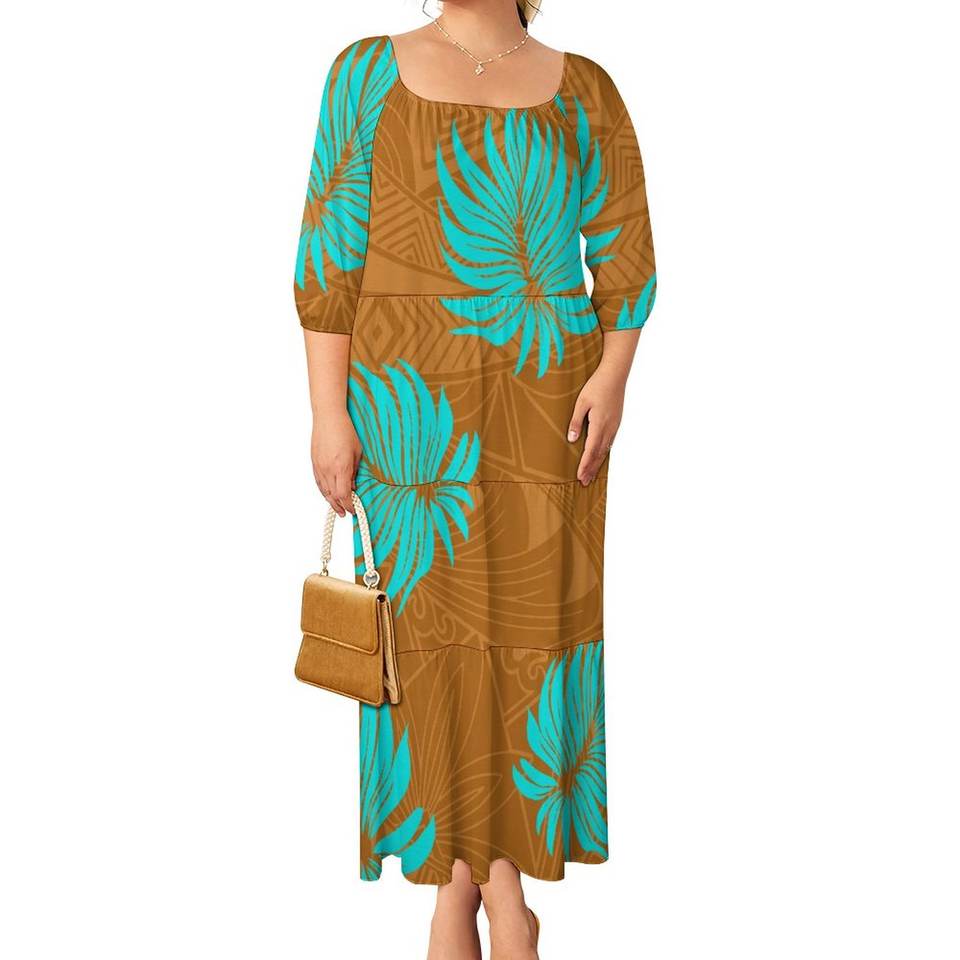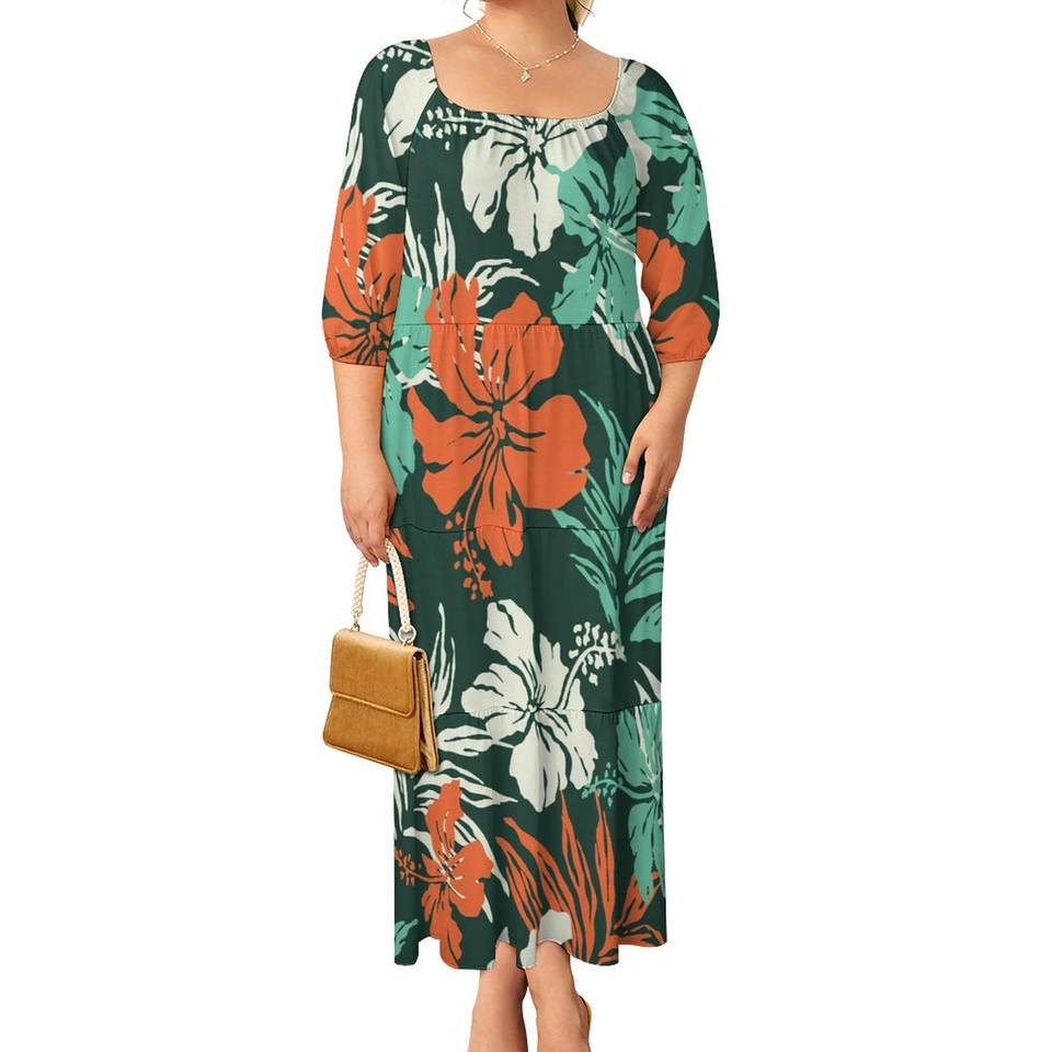 Fashion Lady Puff Sleeve Dress Polynesian Tiare Floral Print Green Fishtail Long Dress for Elegant Women Pacific Island Dresses
