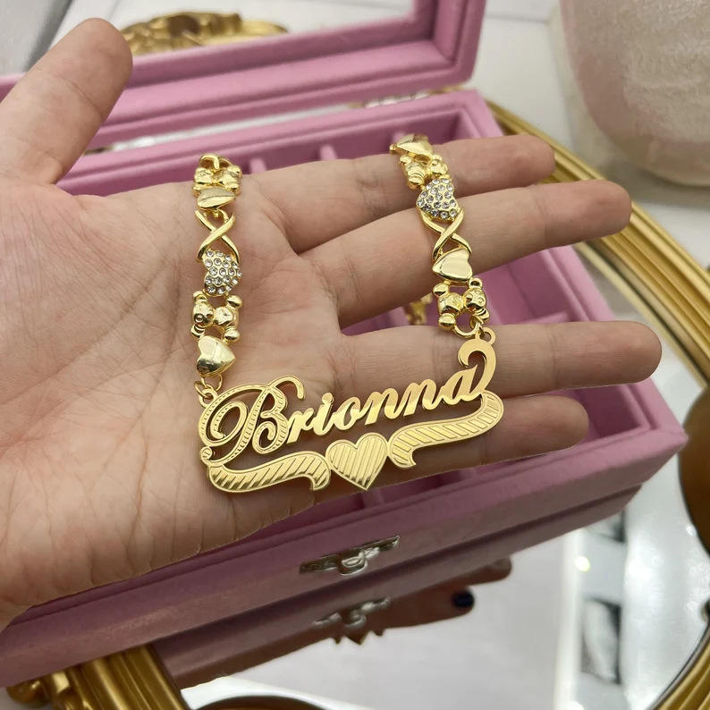 Nuovo Ciondolo Personalizzato a Doppio Strato con Nome e Lettere, Gioiello con Catena a Forma di Cuore e Orsetto