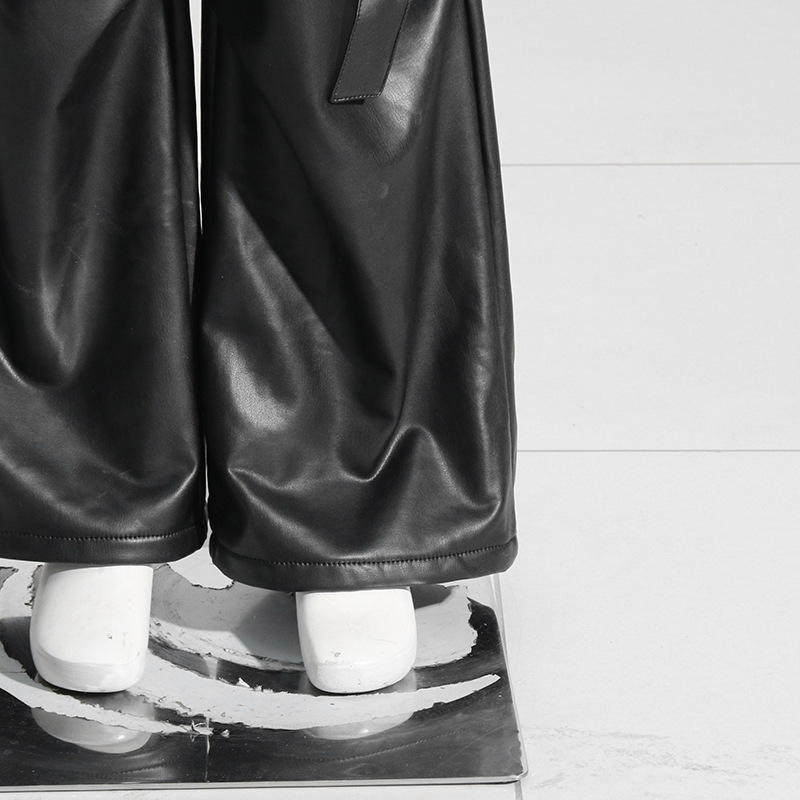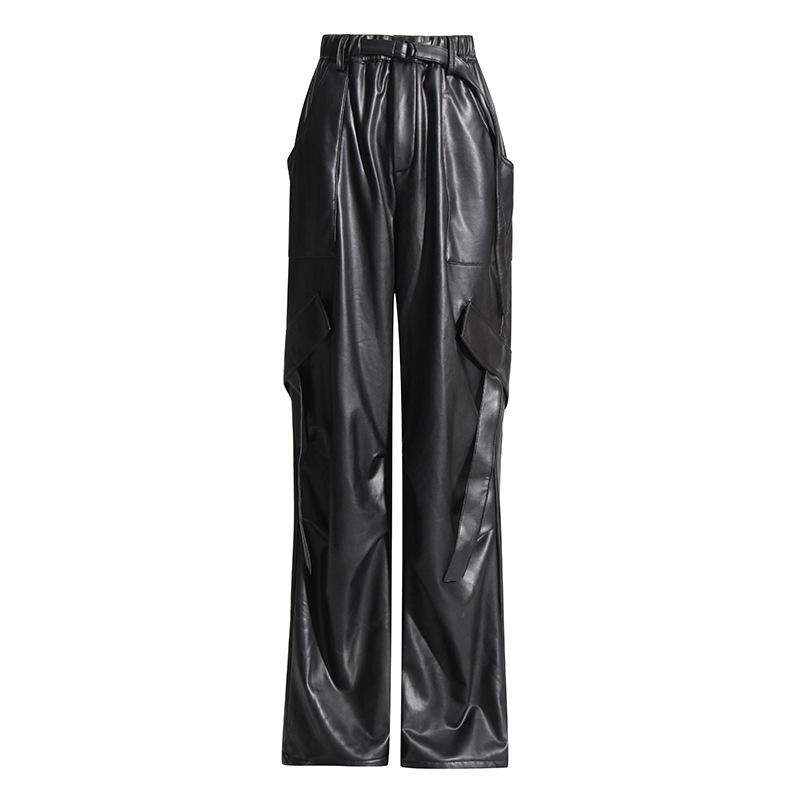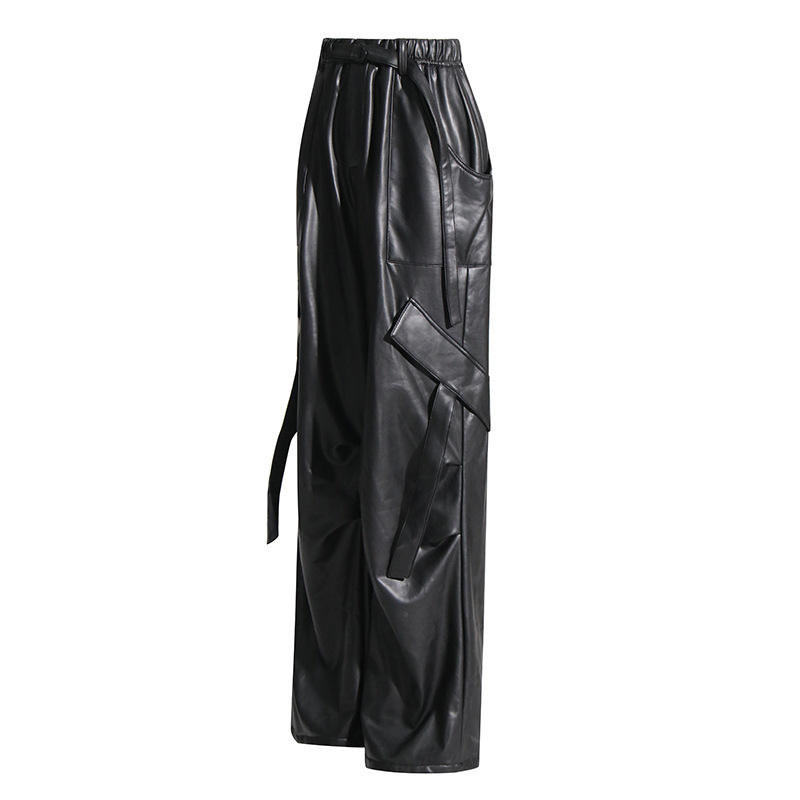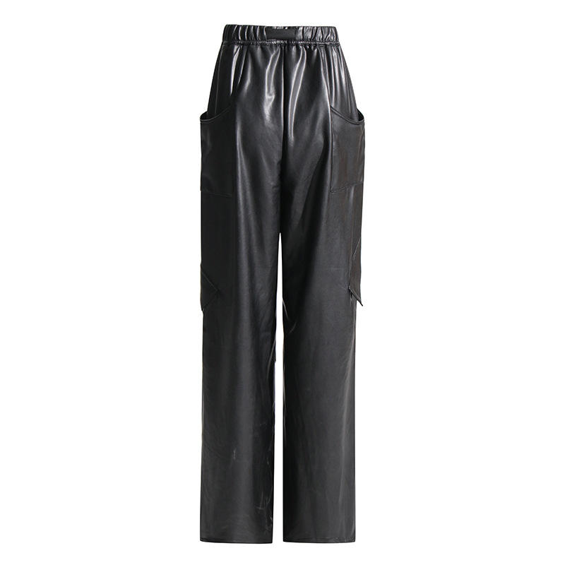 Fashion New Vintage Streetwear Loose Straight Ladies Trouser Solid Color Elastic Waist Wide Leg Pu Leather Cargo Pants Women