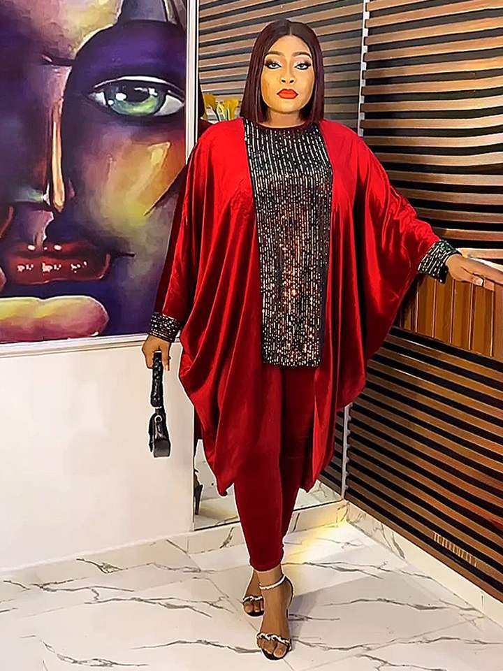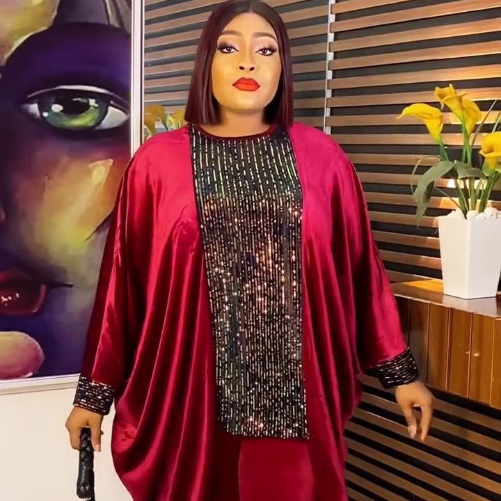 Fashion Plus Size Casual Dresses for African Women Bodycon Silhouette Dashiki Two-Piece Sets-Lace Top Pants Suit for Parties