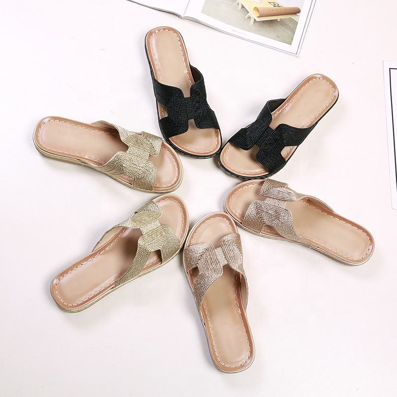 Fashion Pu H Shape Flat Open Toe Slip on Summer Ladies Slippers and Sandals for Women