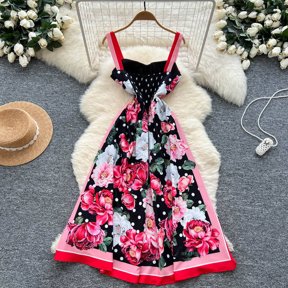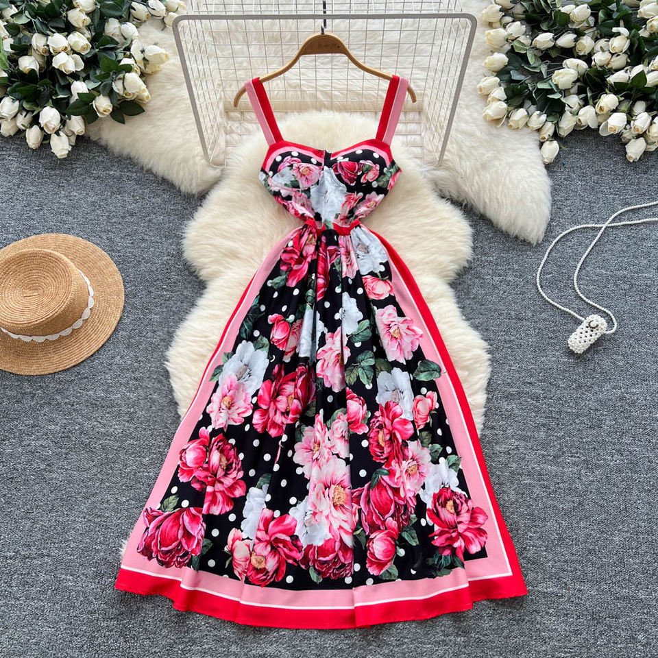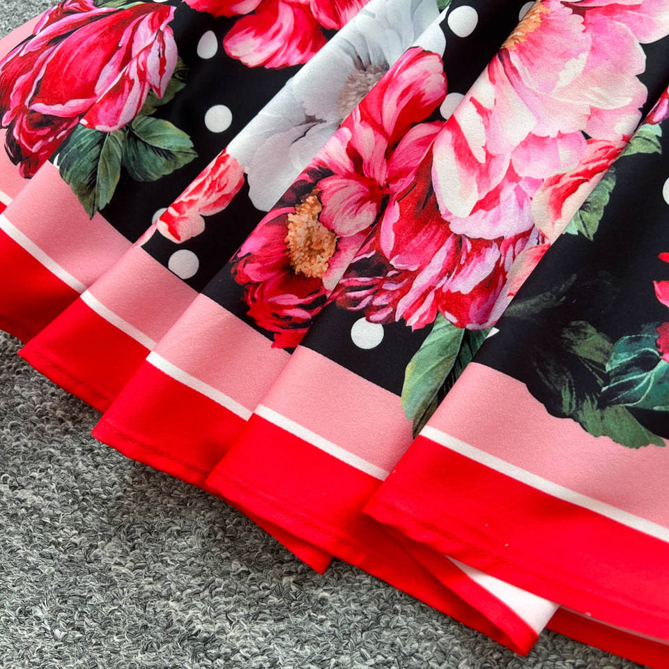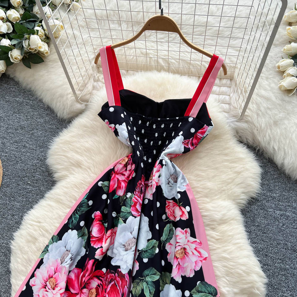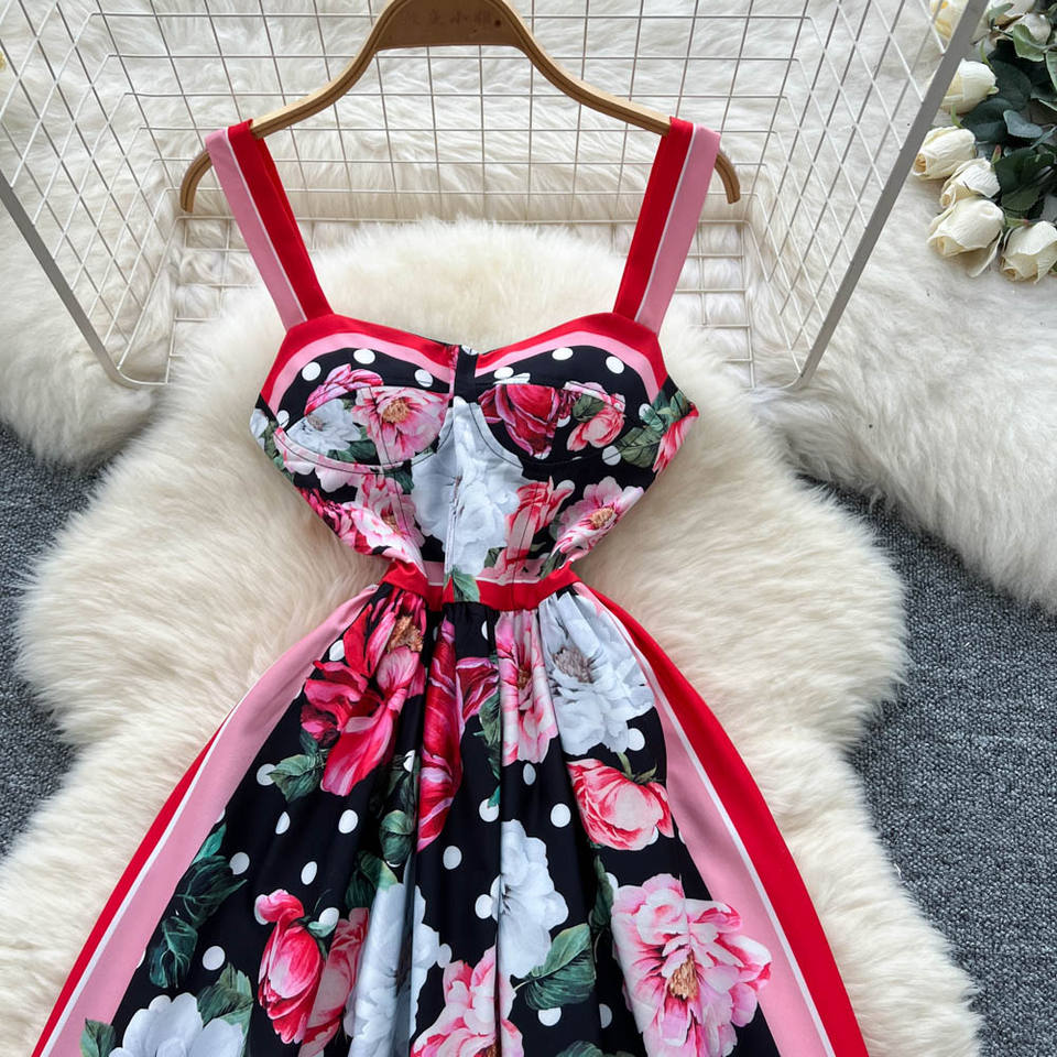 Abito con Bretelle Stile Retrò Elegante, Stampa Personalizzata, Effetto Snellente in Vita, Ampia Gonna a Ruota