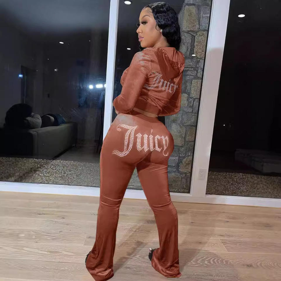 Tuta Sportiva da Donna in Velluto con Lettere in Strass, Completo Due Pezzi alla Moda