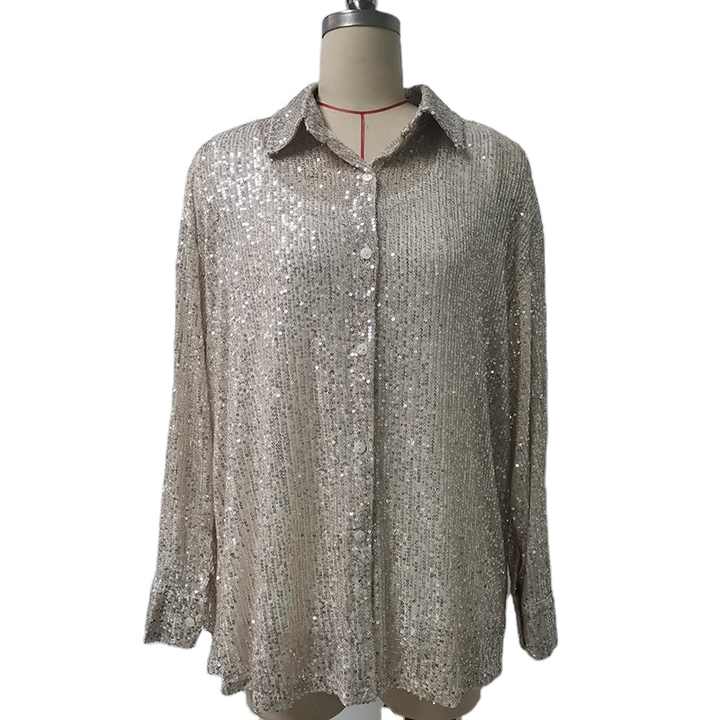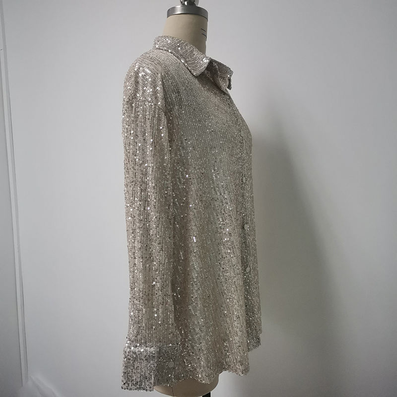 Fashion Sexy Nightclub Long Sleeve Blouses Loose Silver Shiny Sequin Tops Shirt for Women Women's Performance Dress