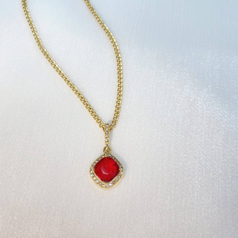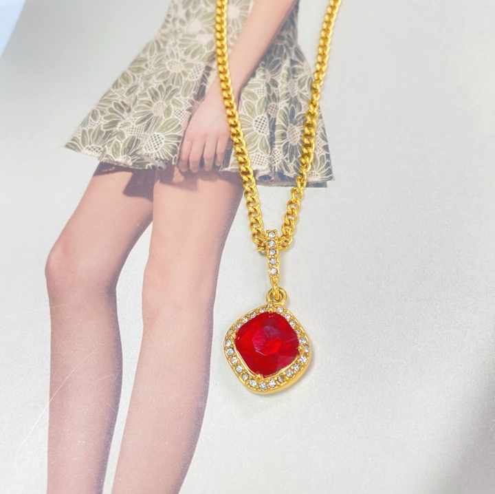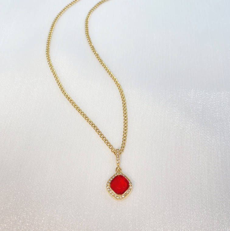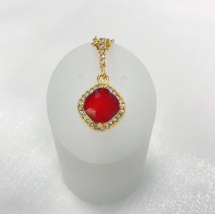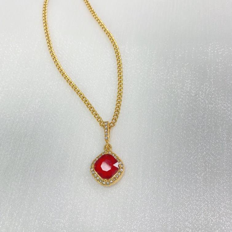 Collana di Moda con Rubino Quadrato, Pendente con Diamante, Collana con Gemma Rossa, Rubino Tagliato con Design a Halo, Gioielli Placcati Oro 18k per Donne