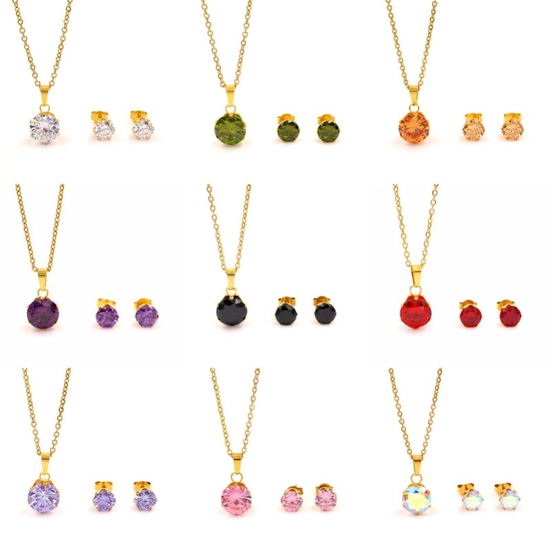 Set collana e orecchini acciaio inox placcato 18K con zirconi 3A tondi multicolore, griffe, per donna, SET18550-1001, MOQ 6 pz