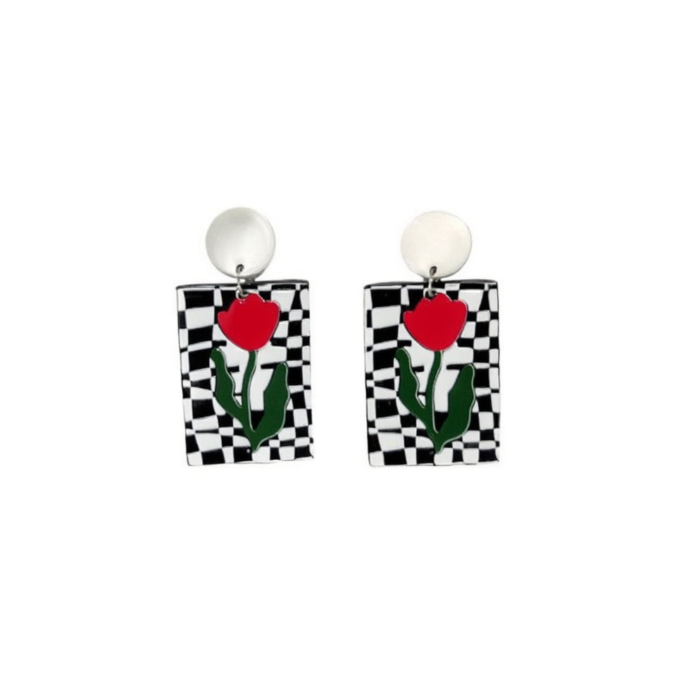 Fashion Stud Earrings Black White Checkered Red Tulip Design 12Pcs Set