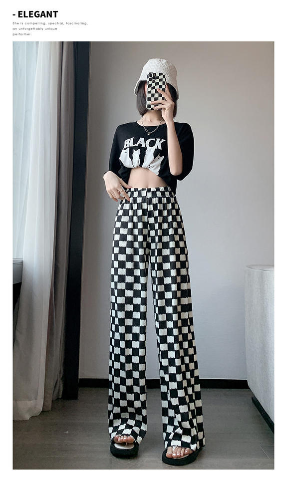 Fashion Style Wide Leg Flare Pants Women Thin Summer Plaid Pants Plus Size Women Trousers Over Size Checkered Pants High Waist