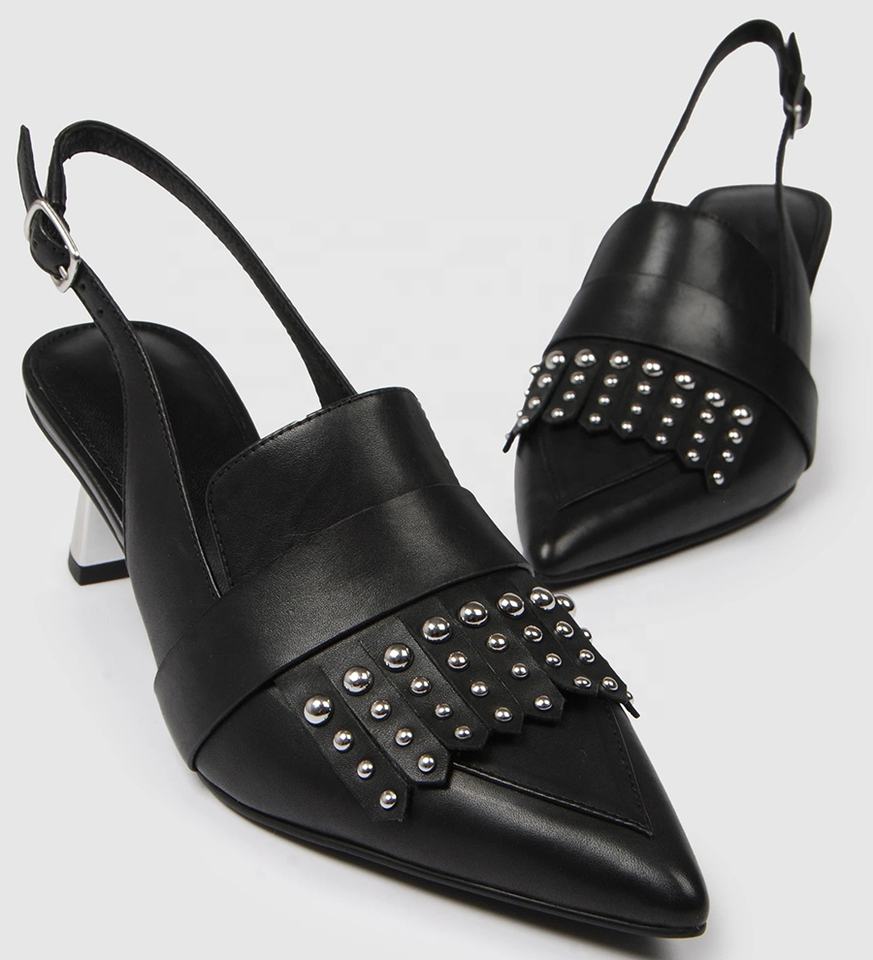 Fashion Tassels With Studs Slingback Black Kitten Heel Leather Lady Shoes