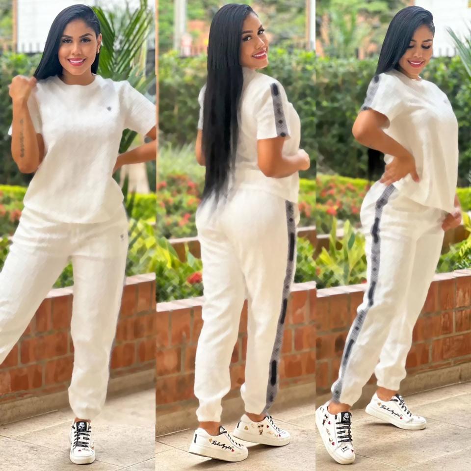 Fashion Wholesale Women Brand Clothing New Fashion Casual Jacquard Two-Piece Set Short Sleeve Top Long Pants