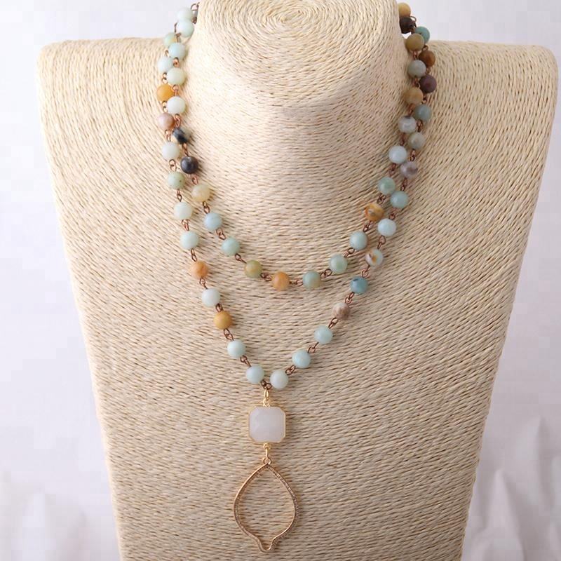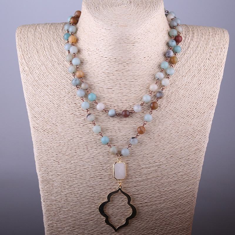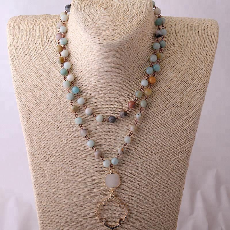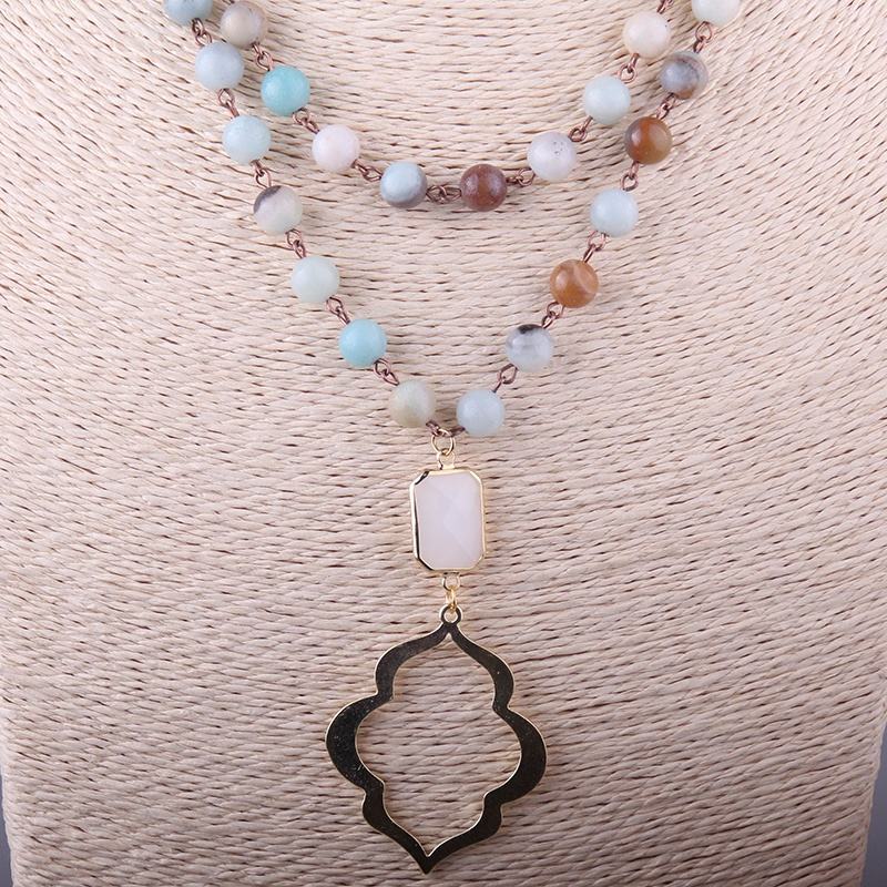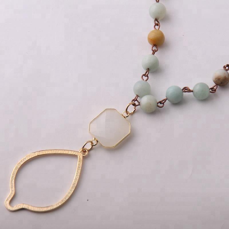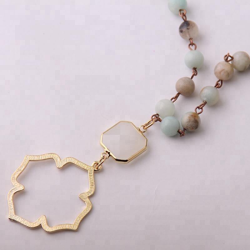 Fashion Women BohemianTribal Jewelry Square Crystal Link Metal Flower of Life Pendant Necklace Natural Amazonite Stone Necklace