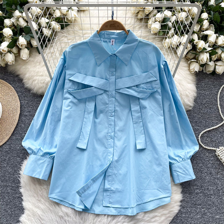 Fashion Women Lantern Sleeve Shirt with Bow Knot Loose Casual Button-Up Blouse