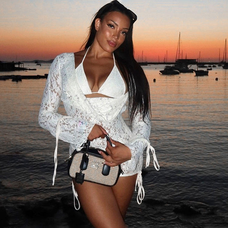 Completo da Donna Sexy per Club, Nuovo Set Due Pezzi con Top a Maniche Lunghe in Pizzo e Abito in Tinta Unita