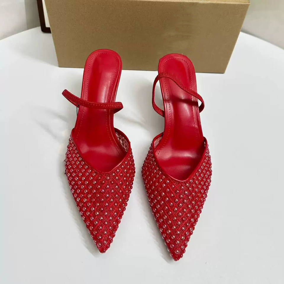 Sandali da Donna alla Moda con Tacco Alto, Punta Chiusa, in Mesh e PU con Perle Artificiali, Tacco a Spillo per Stile Occidentale