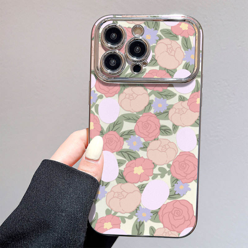 Fashionable Electroplated Flower Design Oil Painting PC Mobile Phone Case for Apple 13PRO Camera Protector Large Windows Cover