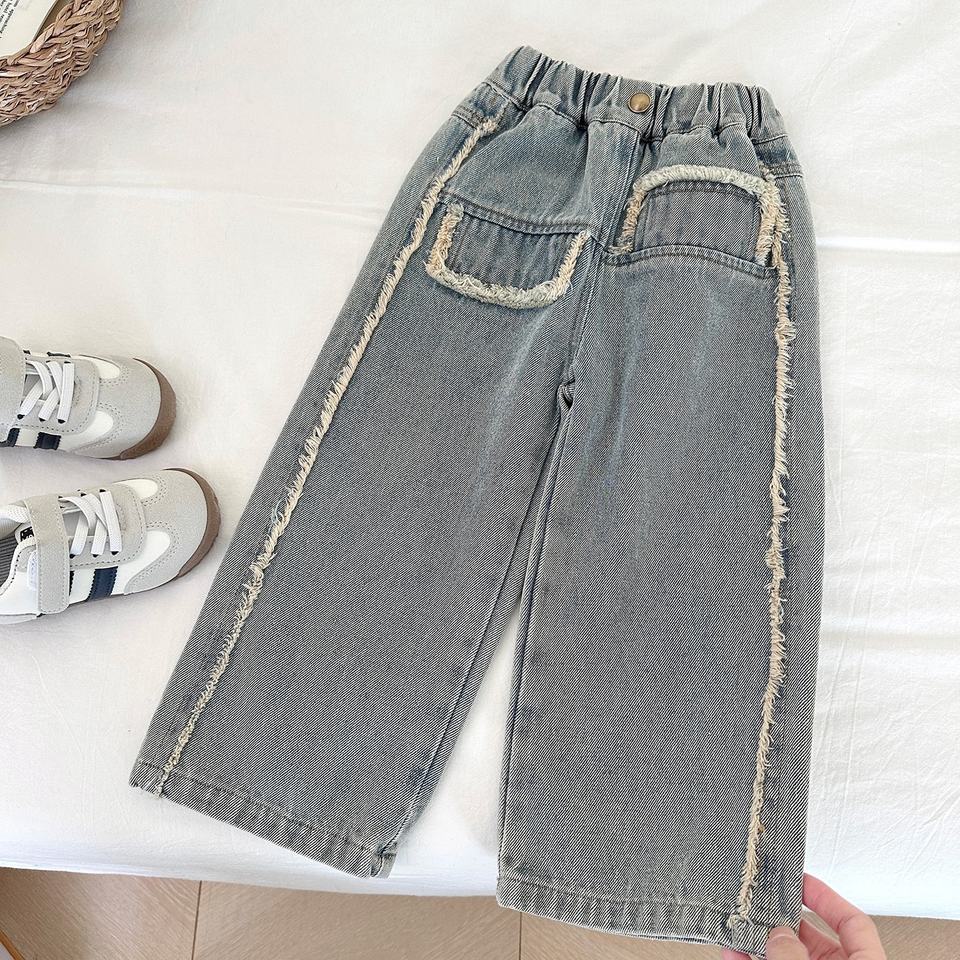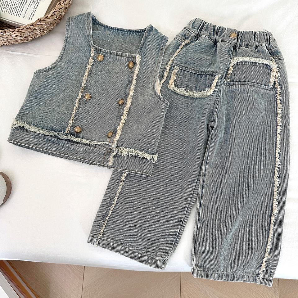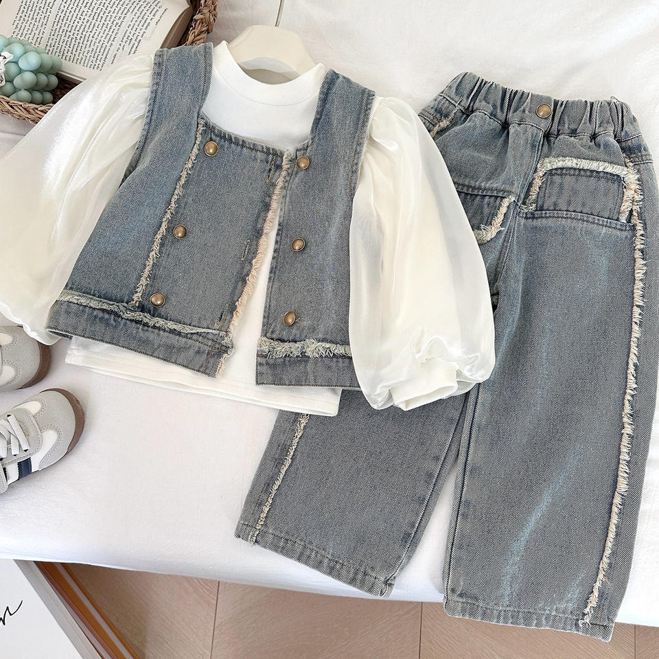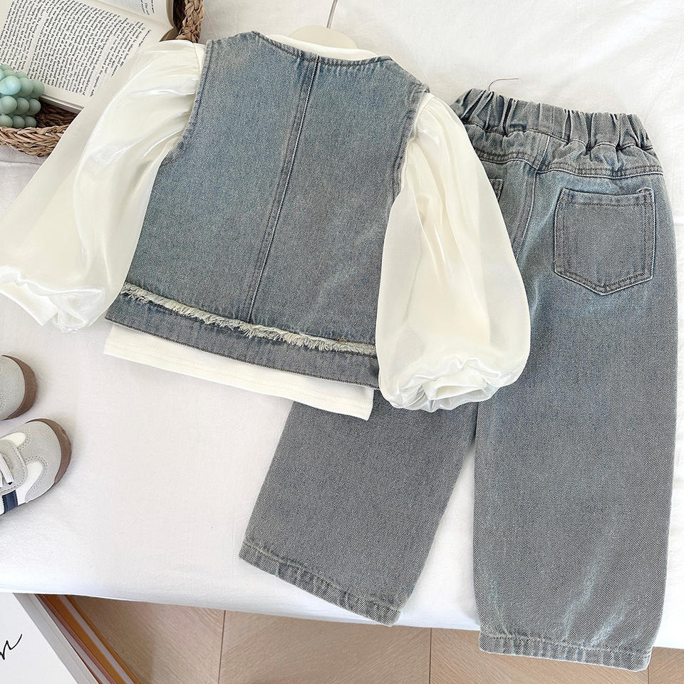 Set Alla Moda per Ragazze con Giacca in Denim e Pantaloni, Top a Maniche Lunghe Autunnale, Motivo Uniforme, Tre Pezzi Popolari Online