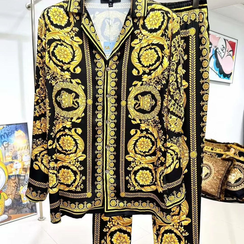 Alla moda pigiama da uomo in seta di alta qualità con monogramma blu a maniche lunghe pigiama 2 pezzi da uomo e da donna