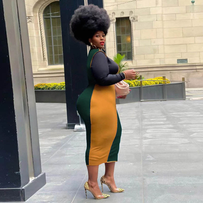 Fashionable Patchwork Color Bodycon Knee-Length Maxi Dress Loose Silhouette Plus Size XS-2XL Office Ladies