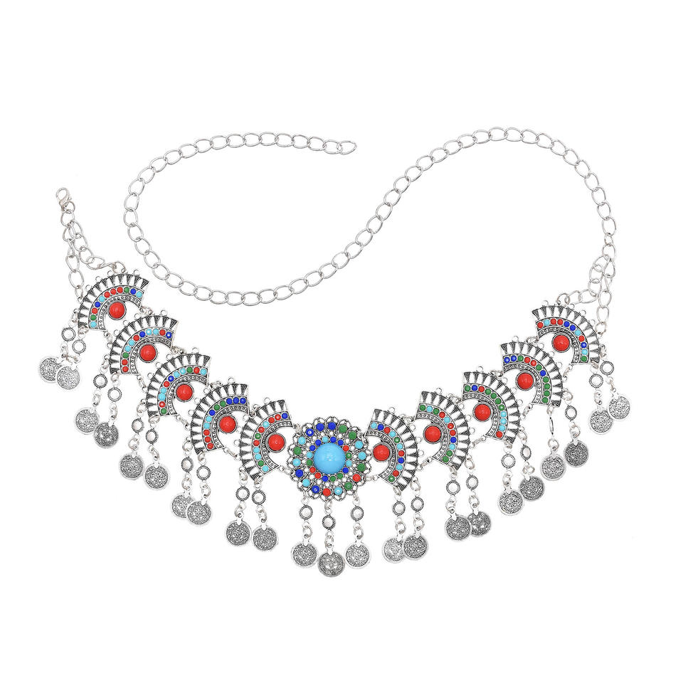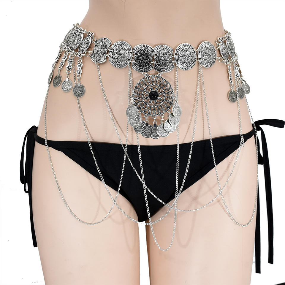 Fashionable Vintage Alloy Afghani Kuchi Tribal Metal Belt With Coins Tassels Pendant Body Waist Chain for Lady