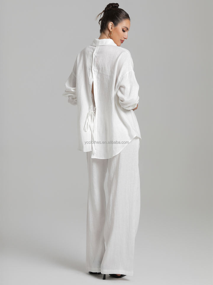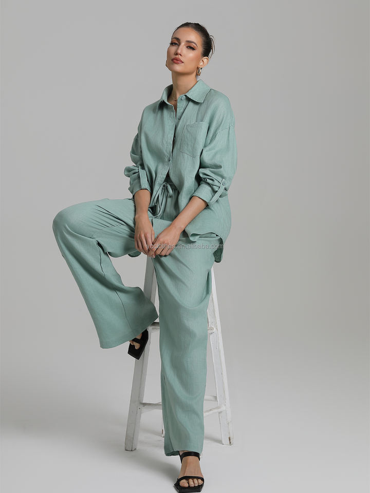 Fashionable Women's Casual Pants Suit 100% Linen Sun-Protection Long-Sleeve Shirt Breathable Blouse Simple Temperament Woolen