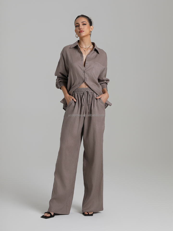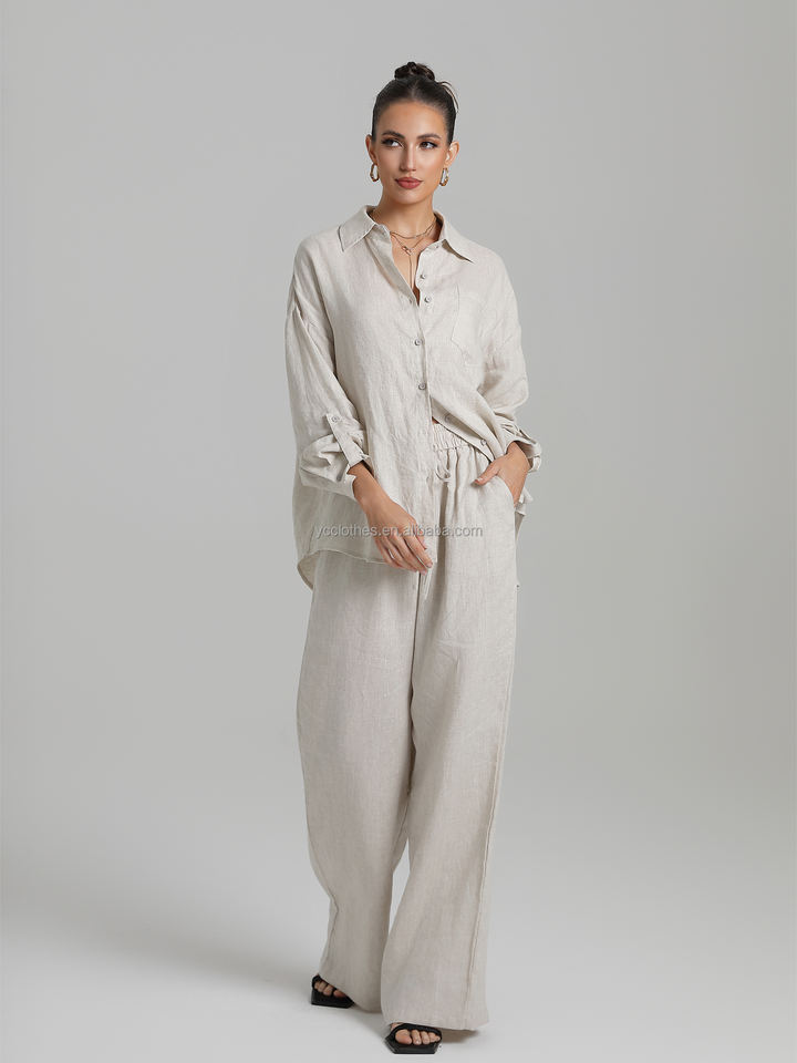 Fashionable Women's Linen Suit 100% Linen Blouse Casual Pants Simple Temperament Breathable Tops Sun-Protection Sleeves Solid