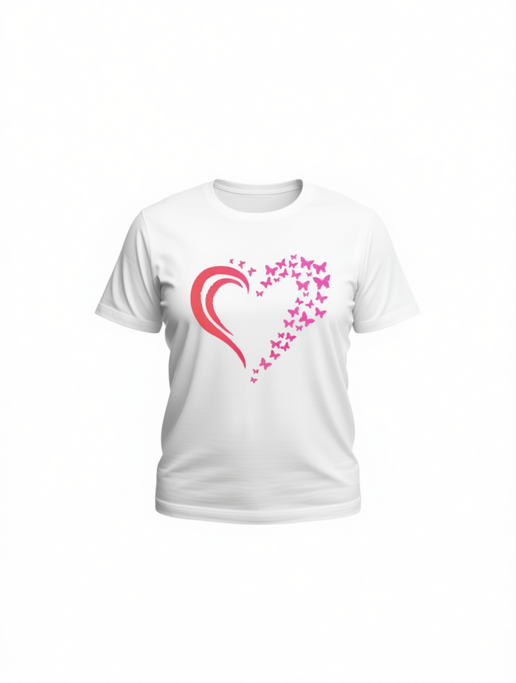 Fashionable Women's Round Neck T-Shirt Short Sleeve Heart Butterfly Love Theme Pattern Casual Spring Summer 100% Cotton Jersey