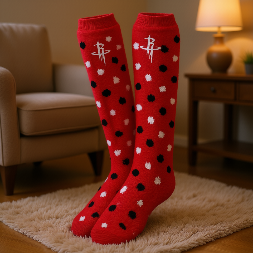 Fbf Originals Calzini da donna Houston Rockets al ginocchio con pois, rosso bianco nero, calzini sportivi invernali lavorati a maglia