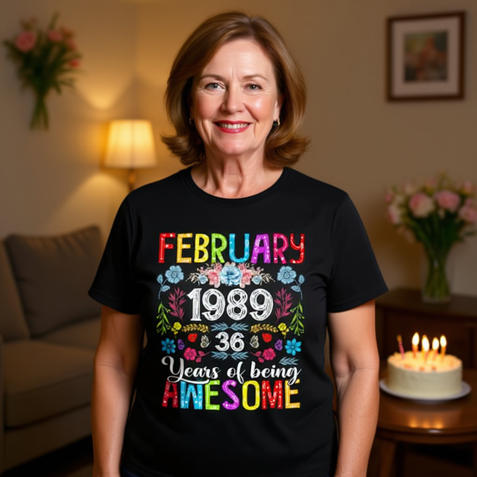 Maglietta floreale per compleanno di 36 anni, febbraio 1989, da donna, girocollo, manica corta, stampa digitale, regalo per adulti
