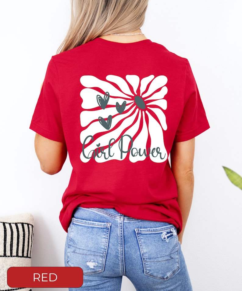 T-shirt da donna con stampa floreale rossa 'Girl Power', vestibilità regolare, girocollo, manica corta, 100% cotone, abbigliamento casual