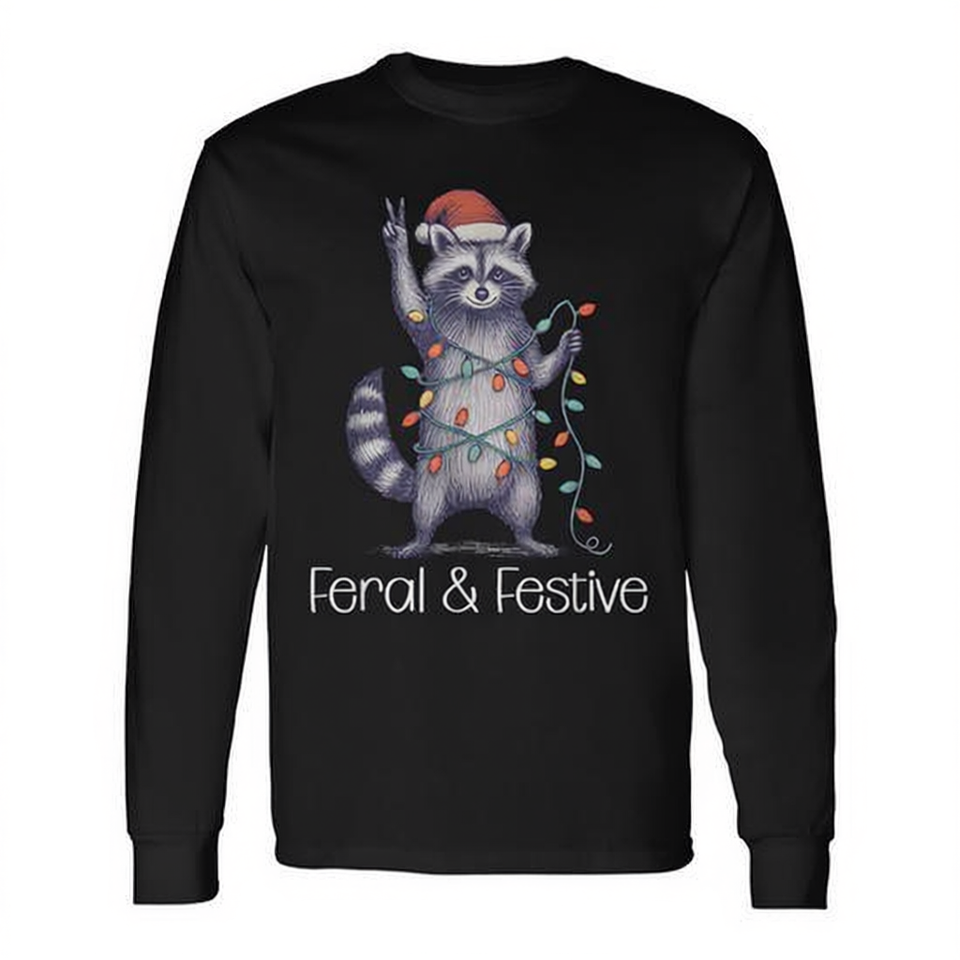 T-shirt a maniche lunghe natalizia con procione selvaggio e festoso