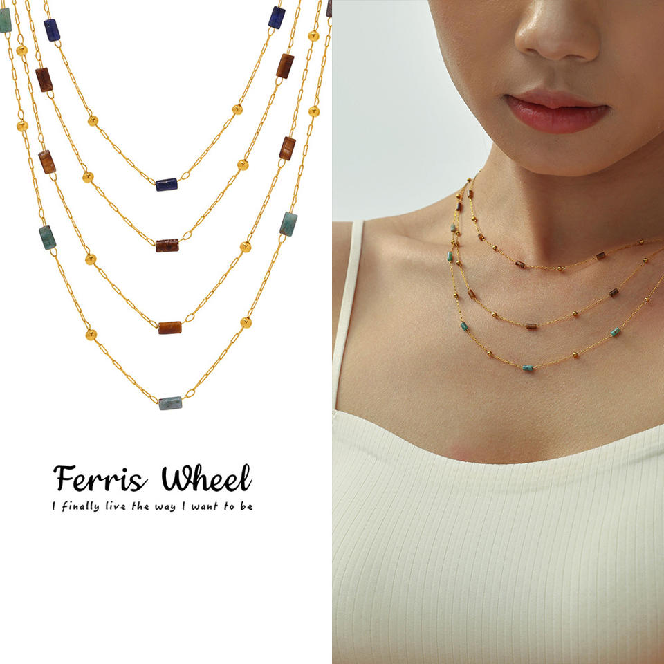 Collana con Catena a Croce Dorata in Acciaio Inossidabile Stile Ruota Panoramica, Collana Artigianale con Perle di Pietra Naturale, Collana a Catena per Clavicola in Lapislazzuli