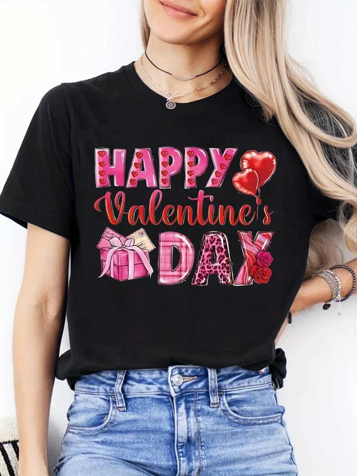 Festival Style Women's Short Sleeve T-Shirt Valentine Heart Print Casual Top Fashion Summer Cotton Jersey Regular Fit