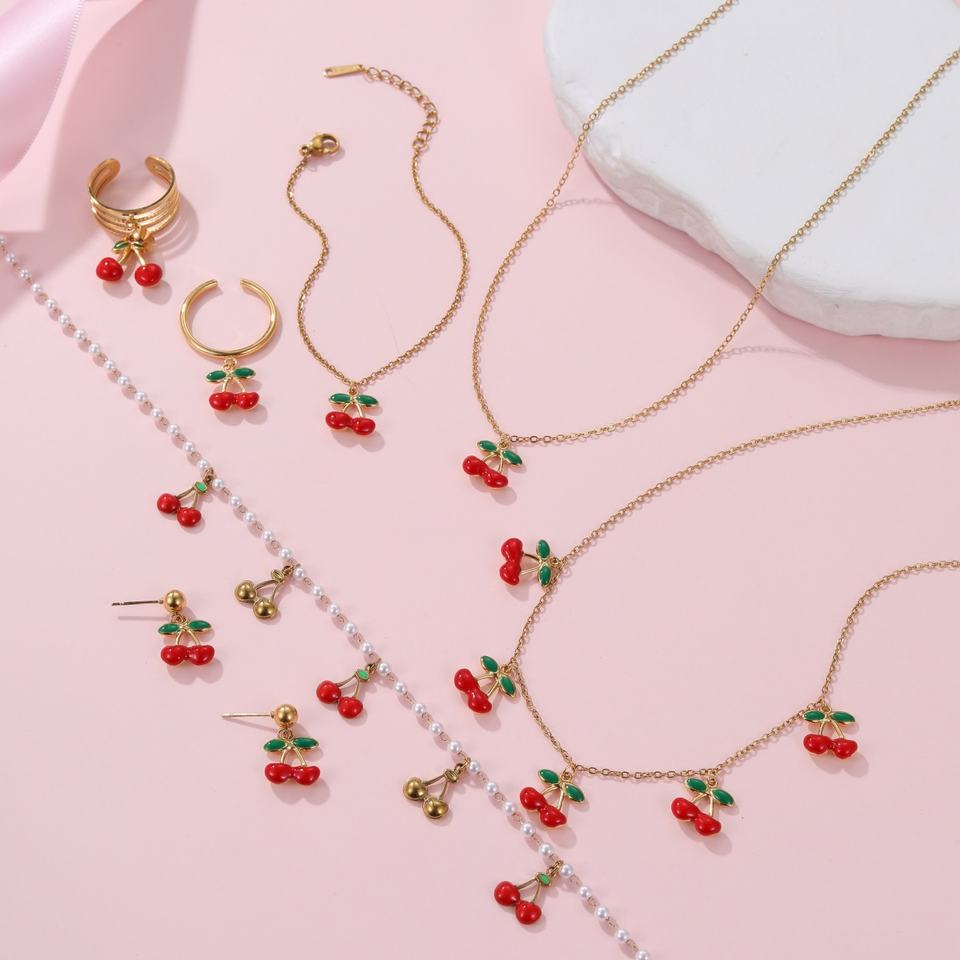 Set di Gioielli Raffinati per Ragazze con Grazioso Elemento Frutta Smaltato, Collana e Orecchini a Ciliegia, Bracciale e Anelli in Acciaio Inossidabile, Impermeabili