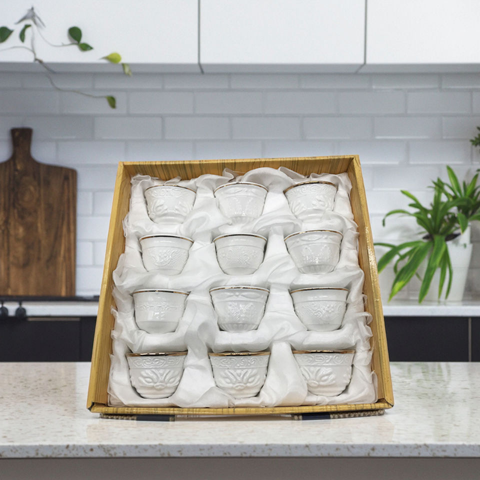 Set di 12 Tazze da Caffè Arabo in Fine Porcellana Ceramica Ecologica con Piattini e Confezione Regalo