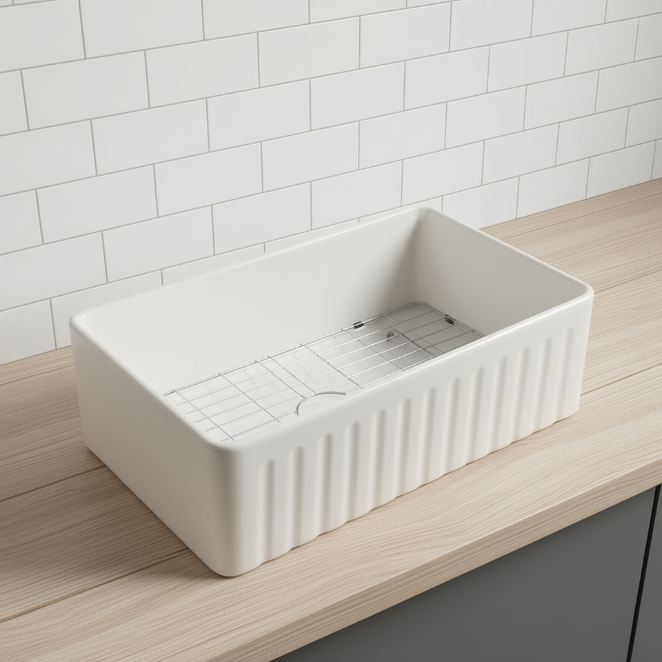 Lavello da Cucina Rettangolare Artigianale in Argilla Refrattaria Stile Rustico 36x20 Pollici, Vasca Singola con Frontale a Grembiule, Griglia e Filtro, Finitura Opaca