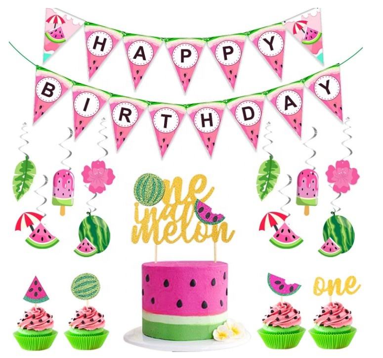 Decorazioni per il primo compleanno per ragazze Banner di buon compleanno One in A melone Cake Topper anguria 1 ° compleanno Party Set